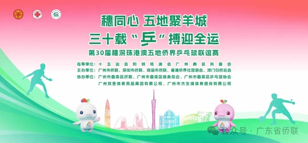 为喜迎第十五届全国运动会,促进粤港澳大湾区侨界交流合作,2025年9月5-7日,由十五运会和残特奥会广州赛区执委会指导,广州市侨联、深圳市侨联、珠海市侨联、香港侨界社团联会、澳门归侨总会共同举办,广州市侨联承办的“穗同心,五地聚羊城;三十载,‘乒’搏迎全运”——第30届穗深珠港澳五地侨界乒乓球联谊赛在番禺区乒乓球协会球馆举行,来自五地侨界的乒乓球运动员和裁判员100多人热情参与。广州市侨联党组书记、主席卞勇,十五运会和残特奥会广州赛区执委会联络部副部长梁佩珍,广州市侨联党组成员、副主席李妙娟,广州市番禺区委常委、区委办公室主任石巍,深圳市委统战部侨联工作部一级调研员李家繁,珠海市侨联主席张英龙,香港侨界社团联会常务副会长兼秘书长廖宇轩,香港侨界社团联会常务副会长骆镇,澳门归侨总会理事长毕志健,2025年广州国际体育嘉年华传播大使、广州新侨联谊会经贸委员会秘书长李凯伦等出席比赛开幕式。