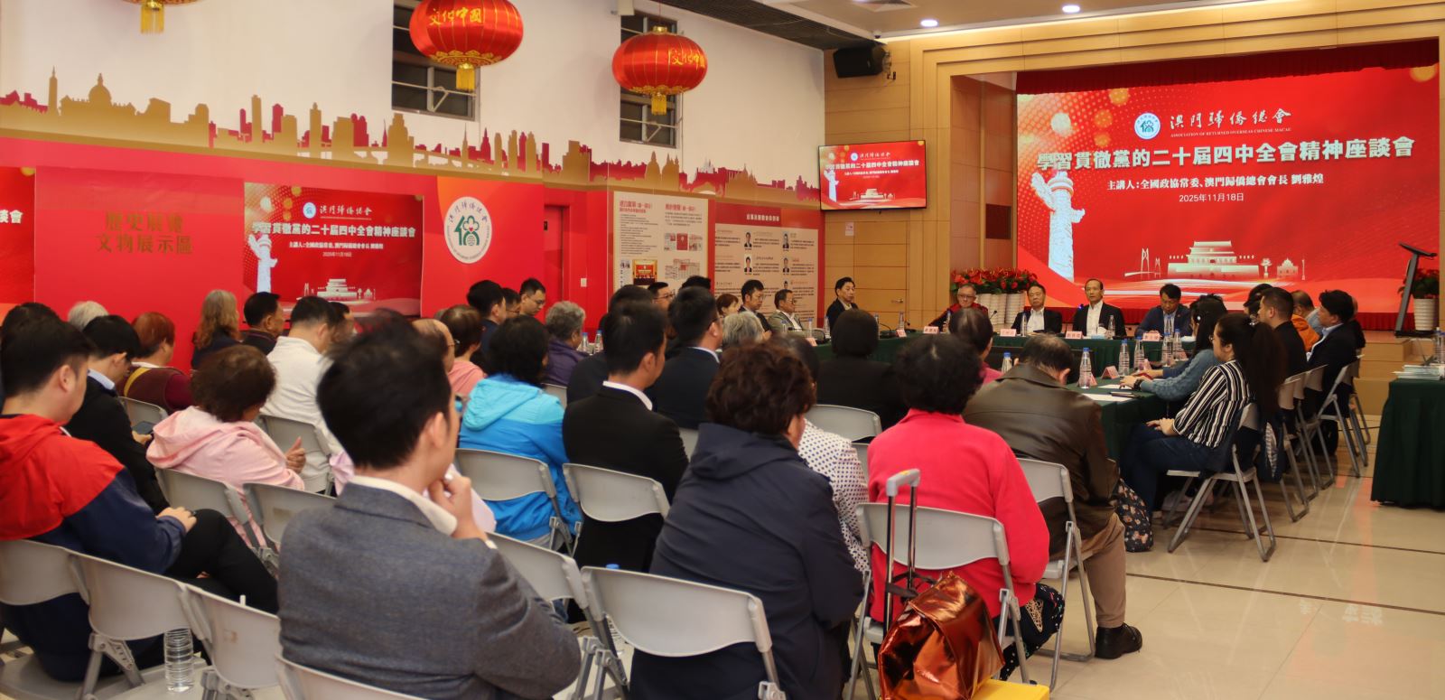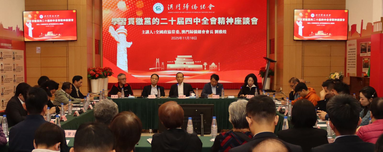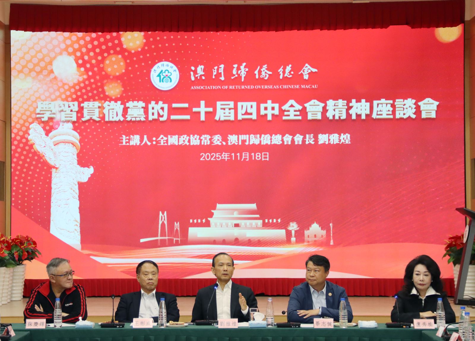 澳門歸僑總會於11月18日在僑總禮堂舉行“學習貫徹黨的二十屆四中全會精神座談會”,全國政協常委、澳門歸僑總會會長劉雅煌作主旨發言,解讀四中全會精神和國家“十五五”規劃建議,以及當前和未來五年澳門僑界的重大政治任務。僑總理事長畢志健、監事長王彬成及多位會領導和理監事等近百人出席。