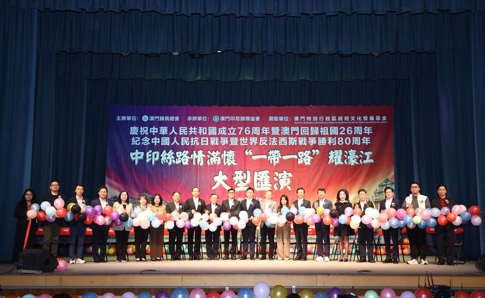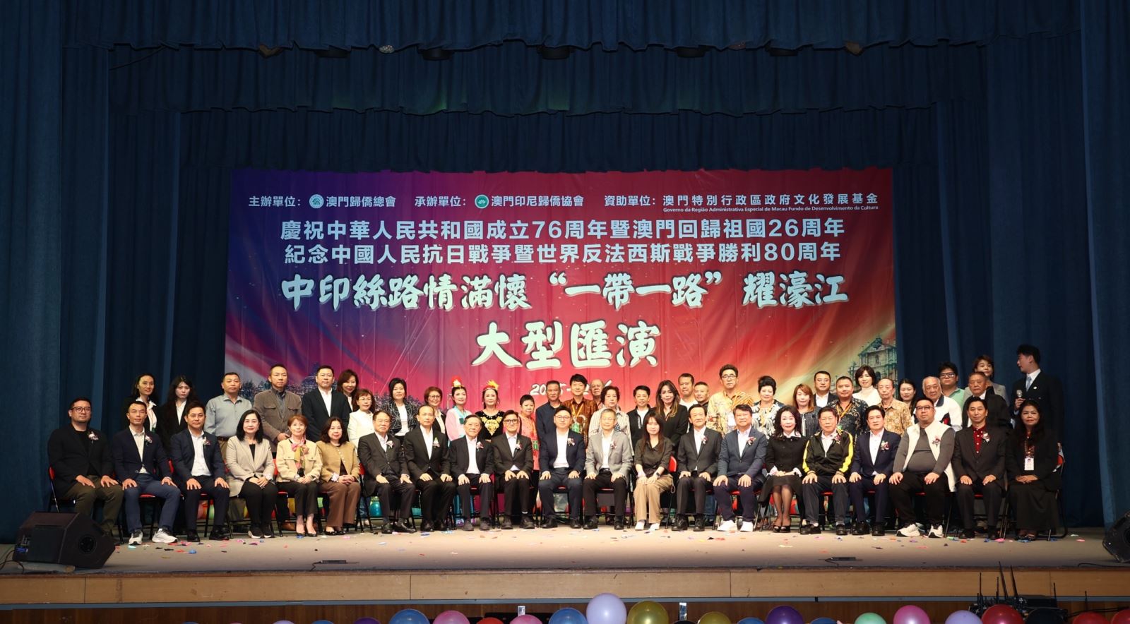 由澳門歸僑總會主辦、澳門印尼歸僑協會承辦,獲文化發展基金資助的第八屆“中印絲路情滿懷‘一帶一路’耀濠江大型匯演”,12月6日晚7時假永樂戲院一院舉行,節目豐富,同賀新中國成立七十六周年、澳門回歸祖國廿六周年、中印尼建交七十五周年,同時紀念中國人民抗日戰爭暨世界反法西斯戰爭勝利八十周年。