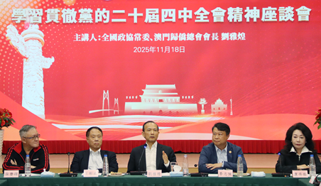 澳門歸僑總會於11月18日在僑總禮堂舉行“學習貫徹黨的二十屆四中全會精神座談會”,全國政協常委、澳門歸僑總會會長劉雅煌作主旨發言,解讀四中全會精神和國家“十五五”規劃建議,以及當前和未來五年澳門僑界的重大政治任務。僑總理事長畢志健、監事長王彬成及多位會領導和理監事等近百人出席。