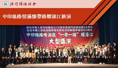 由澳門歸僑總會主辦、澳門印尼歸僑協會承辦,獲文化發展基金資助的第八屆“中印絲路情滿懷‘一帶一路’耀濠江大型匯演”,12月6日晚7時假永樂戲院一院舉行,節目豐富,同賀新中國成立七十六周年、澳門回歸祖國廿六周年、中印尼建交七十五周年,同時紀念中國人民抗日戰爭暨世界反法西斯戰爭勝利八十周年。
