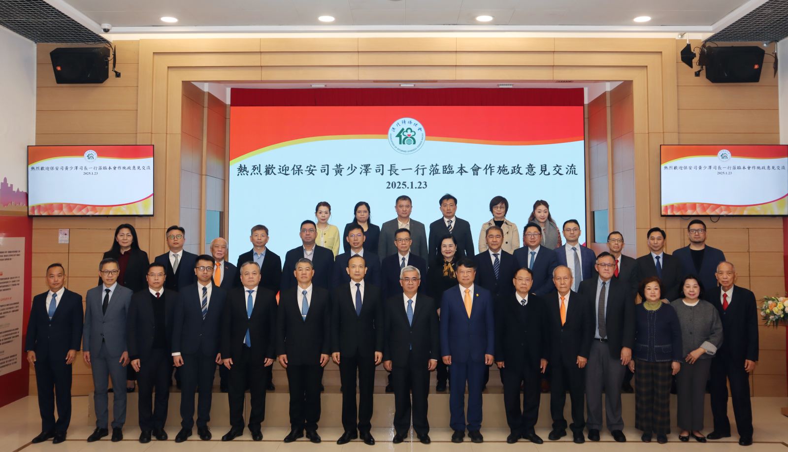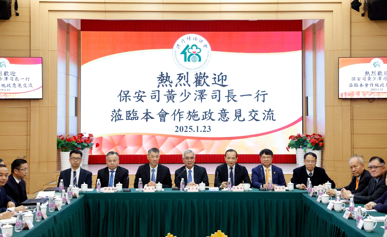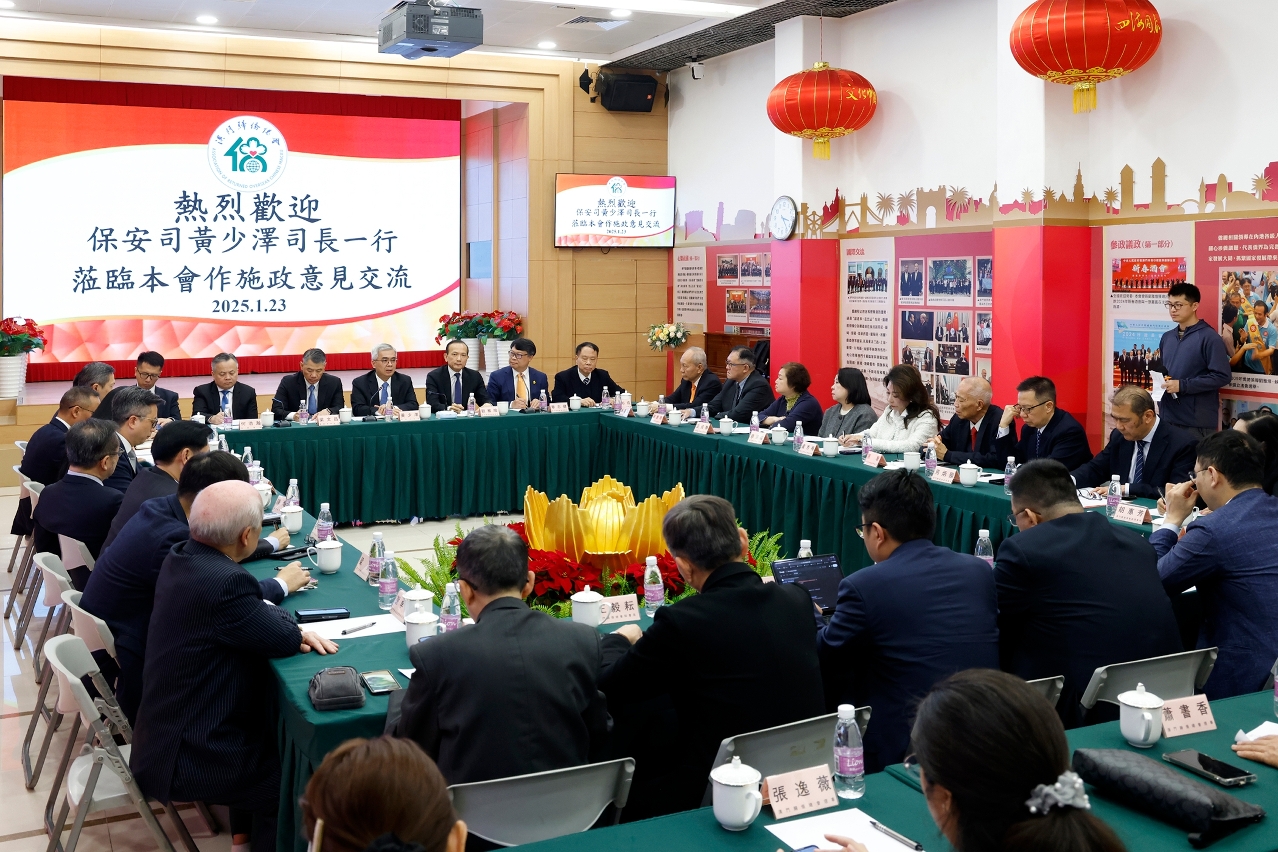 保安司司長黃少澤一行於1月23日下午3時到訪澳門歸僑總會並舉行座談,就編製保安範疇2025年度施政方針聽取意見和建議,獲會長劉雅煌、理事長畢志健、監事長王彬成等的熱情接待。