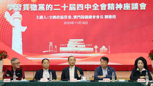 澳門歸僑總會於11月18日在僑總禮堂舉行“學習貫徹黨的二十屆四中全會精神座談會”,全國政協常委、澳門歸僑總會會長劉雅煌作主旨發言,解讀四中全會精神和國家“十五五”規劃建議,以及當前和未來五年澳門僑界的重大政治任務。僑總理事長畢志健、監事長王彬成及多位會領導和理監事等近百人出席。