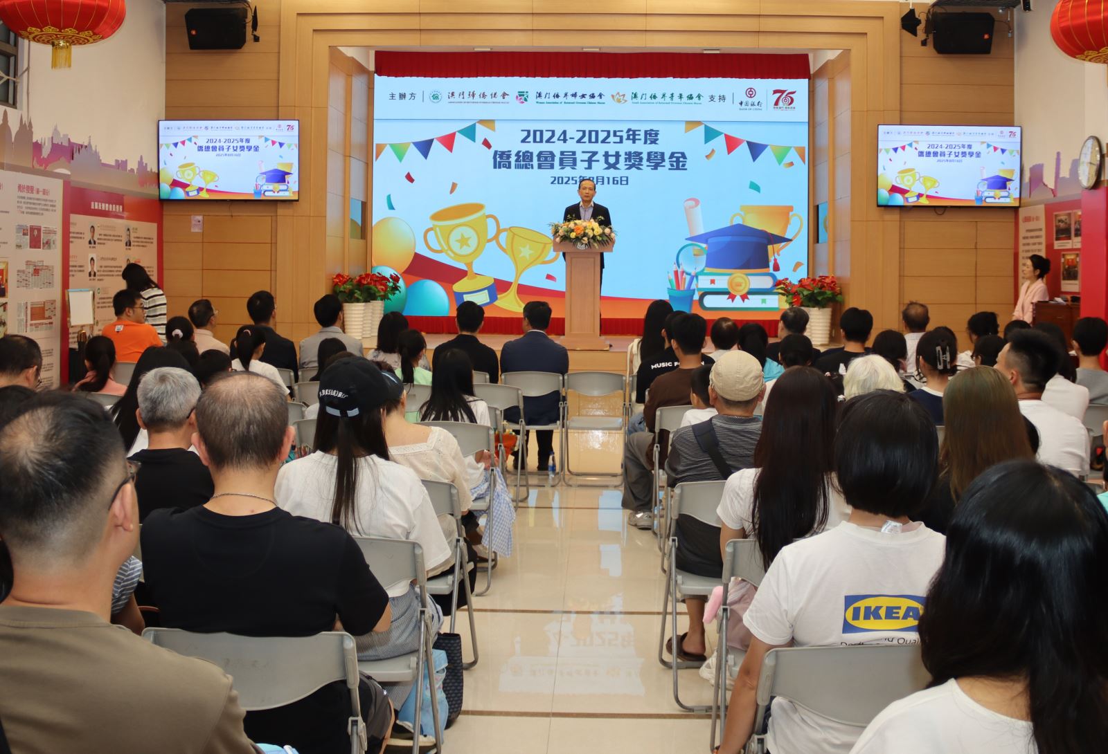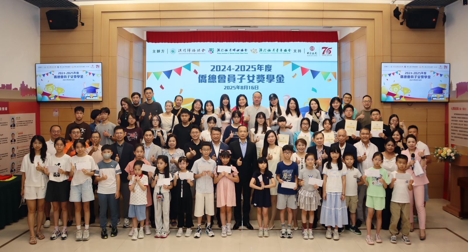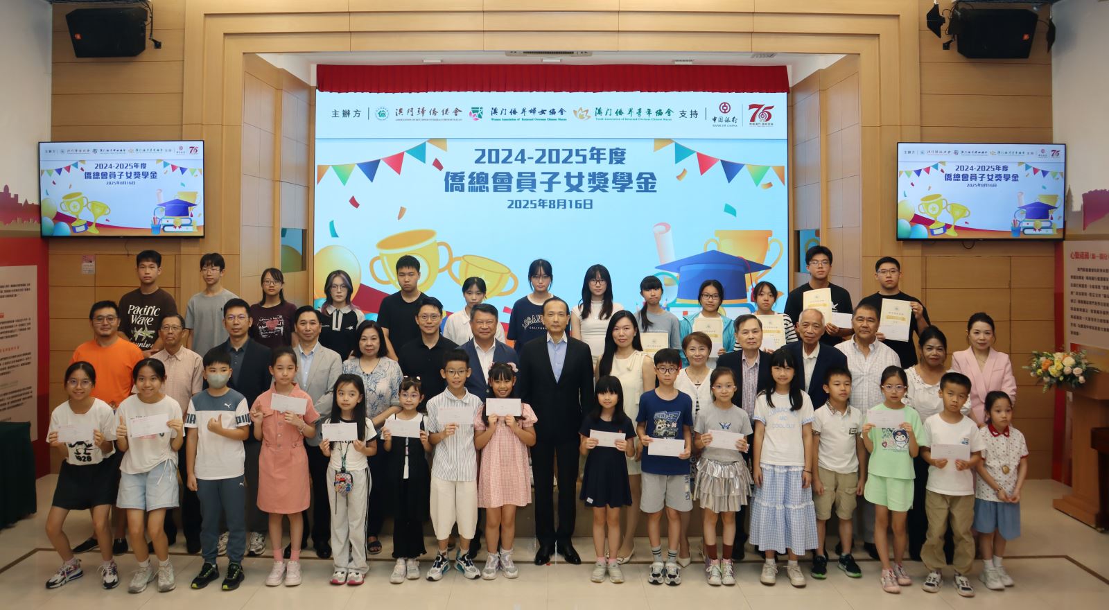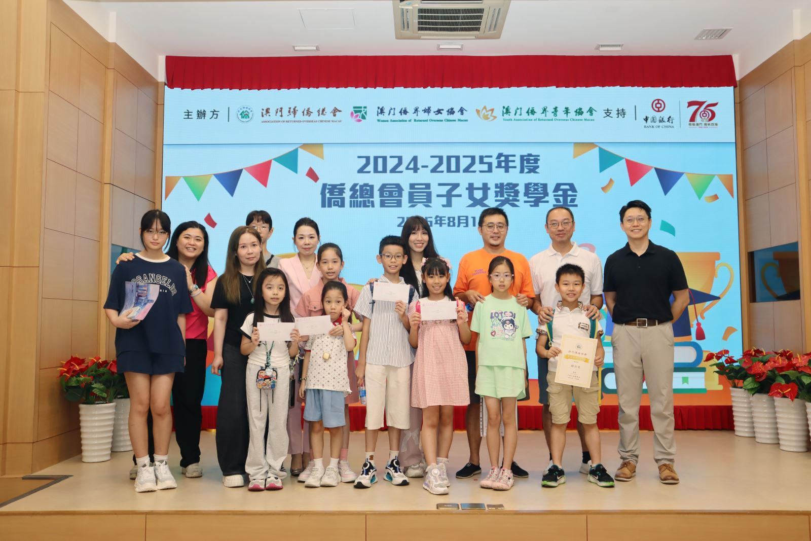 「2024-2025年度僑總會員子女獎學金」頒獎禮於8月16日在僑總禮堂舉行,主辦單位澳門歸僑總會長劉雅煌、僑界婦女協會會長鄧婉玲、僑界青年協會理事長黎光豪,贊助機構中國銀行澳門分行(俾利喇街支行)行長黃一娜,僑總理事長畢志健,副會長陳和標、廖麗瓊、張華、趙文炎、蔡志龍、梁鋼等出席,由僑總理事張蓓主持。