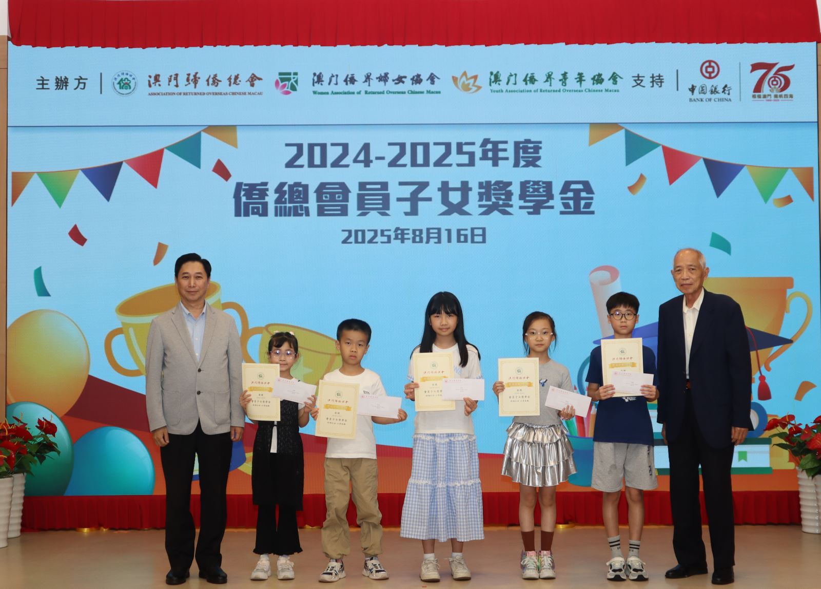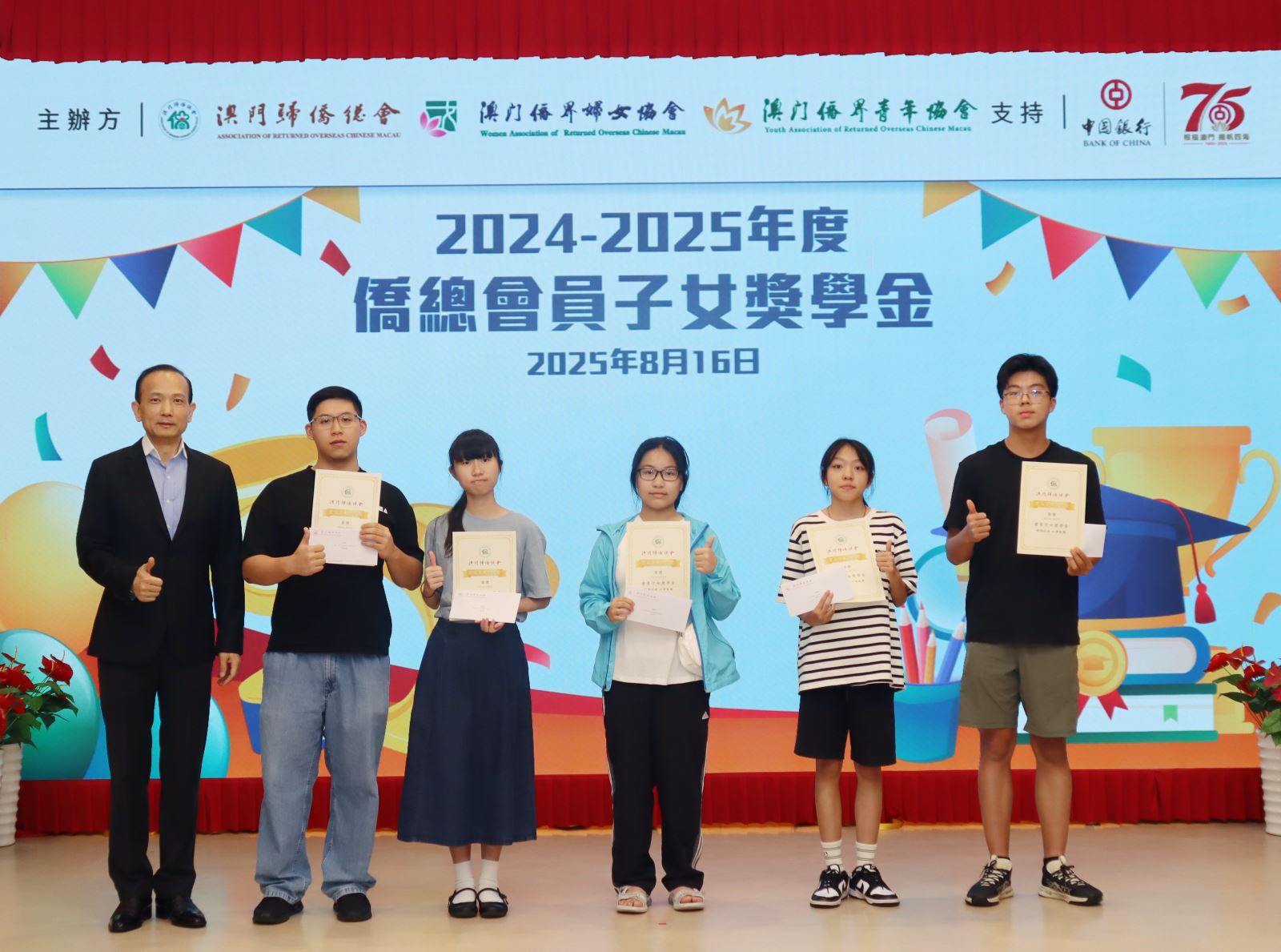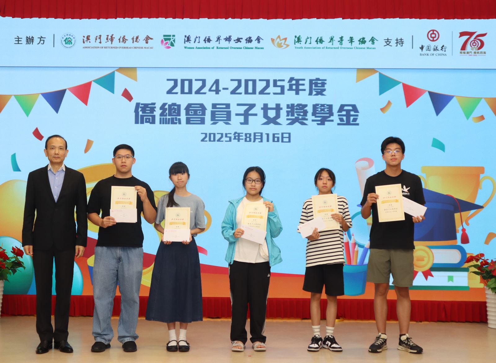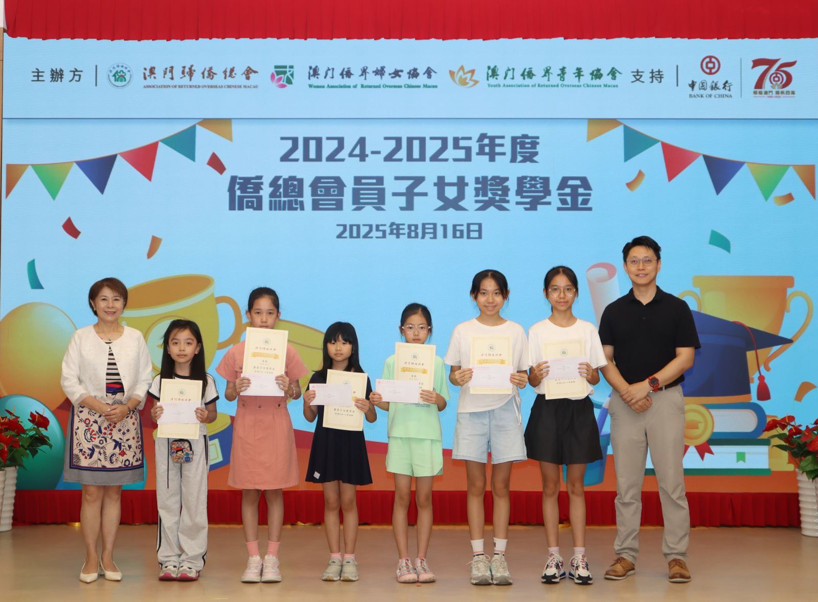 「2024-2025年度僑總會員子女獎學金」頒獎禮於8月16日在僑總禮堂舉行,主辦單位澳門歸僑總會長劉雅煌、僑界婦女協會會長鄧婉玲、僑界青年協會理事長黎光豪,贊助機構中國銀行澳門分行(俾利喇街支行)行長黃一娜,僑總理事長畢志健,副會長陳和標、廖麗瓊、張華、趙文炎、蔡志龍、梁鋼等出席,由僑總理事張蓓主持。