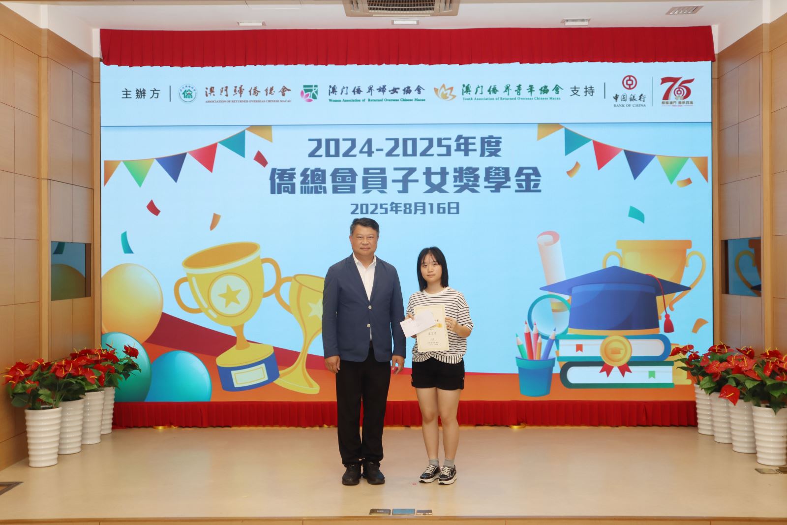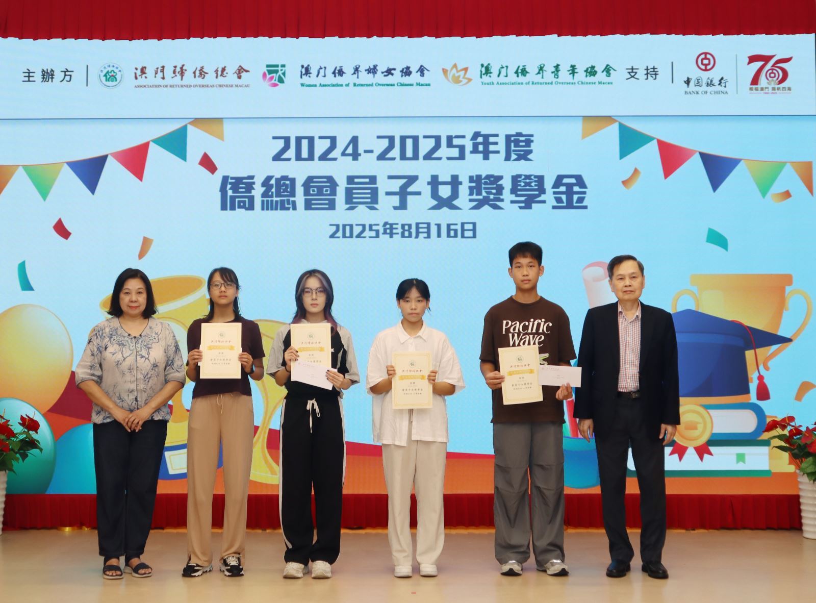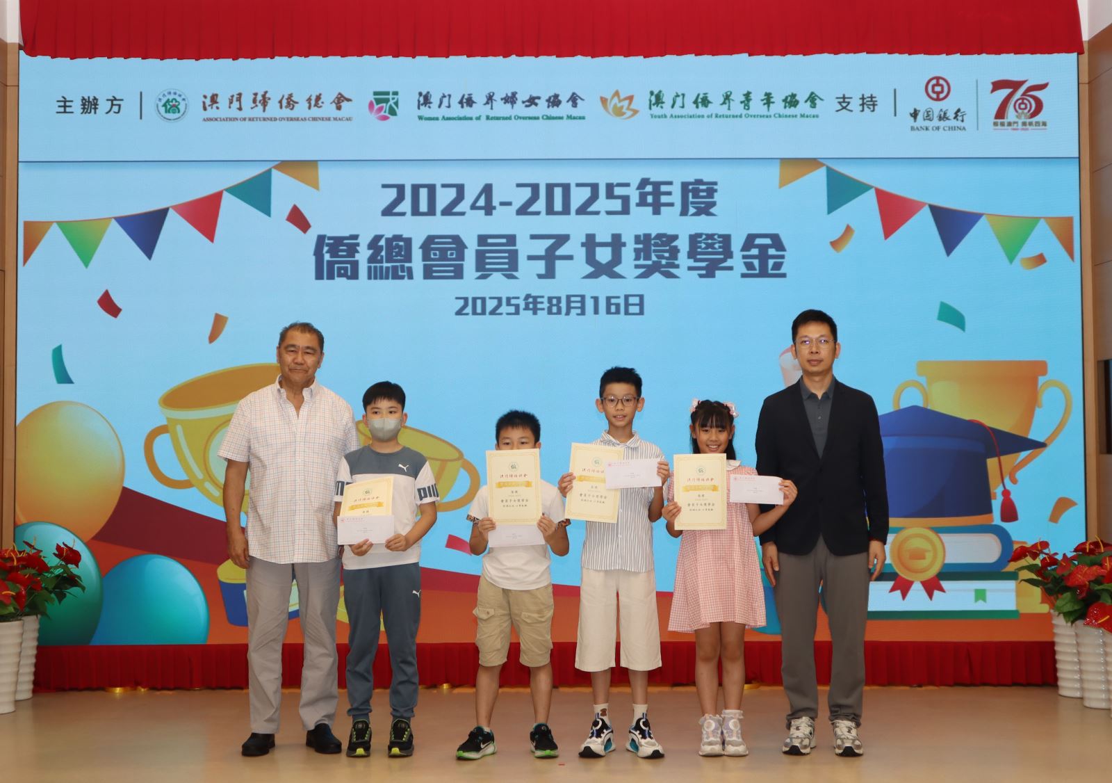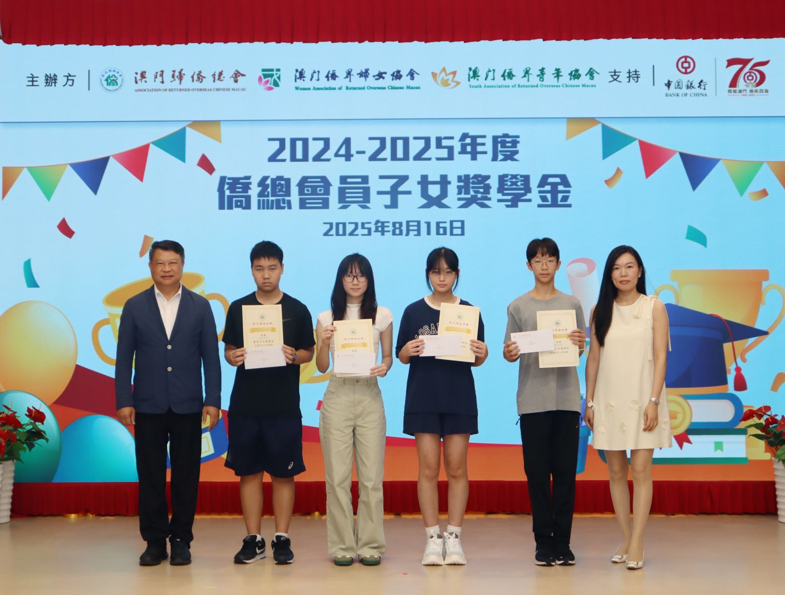 「2024-2025年度僑總會員子女獎學金」頒獎禮於8月16日在僑總禮堂舉行,主辦單位澳門歸僑總會長劉雅煌、僑界婦女協會會長鄧婉玲、僑界青年協會理事長黎光豪,贊助機構中國銀行澳門分行(俾利喇街支行)行長黃一娜,僑總理事長畢志健,副會長陳和標、廖麗瓊、張華、趙文炎、蔡志龍、梁鋼等出席,由僑總理事張蓓主持。