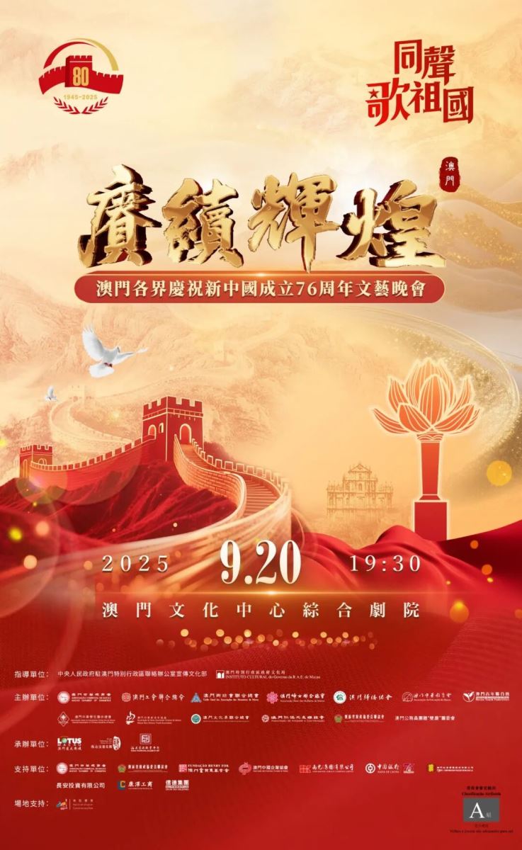 今年恰逢新中國成立76周年、紀念中國人民抗日戰爭暨世界反法西斯戰爭勝利80周年、冼星海誕辰120周年以及《七子之歌》發表100周年,在這一系列具有里程碑意義的節點交織時刻,澳門各界精心準備了“賡續輝煌——澳門各界慶祝新中國成立76周年文藝晚會”,全面展示澳門近年來的藝術成果,彰顯澳門文化藝術的繁榮發展,激發澳門同胞的愛國熱情。