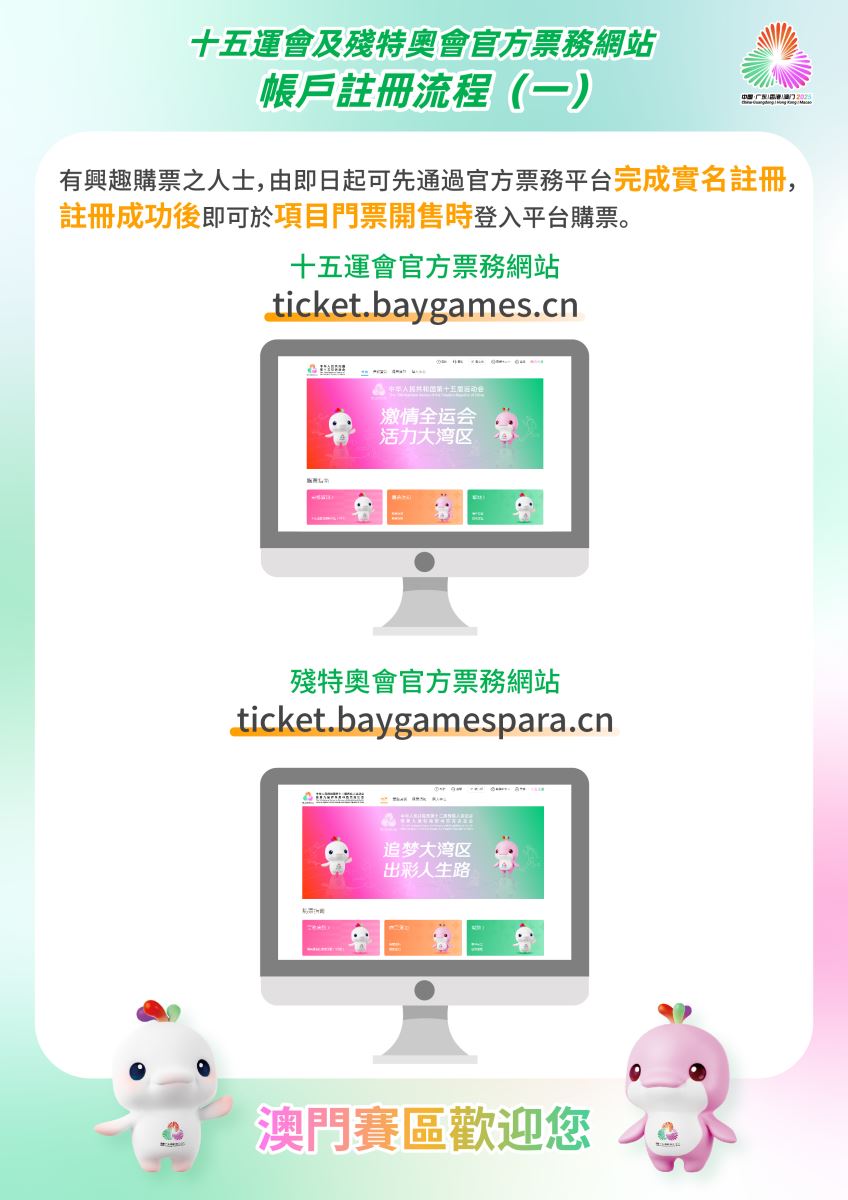 十五運會和殘特奧會賽事分佈在粵港澳三地舉行,門票首次實現“一個平台,三地購票”的模式。 公眾在購買十五運會和殘特奧會門票前,須先通過官方票務平台完成實名註冊,註冊成功后再於專案門票開售時登入平台購票。