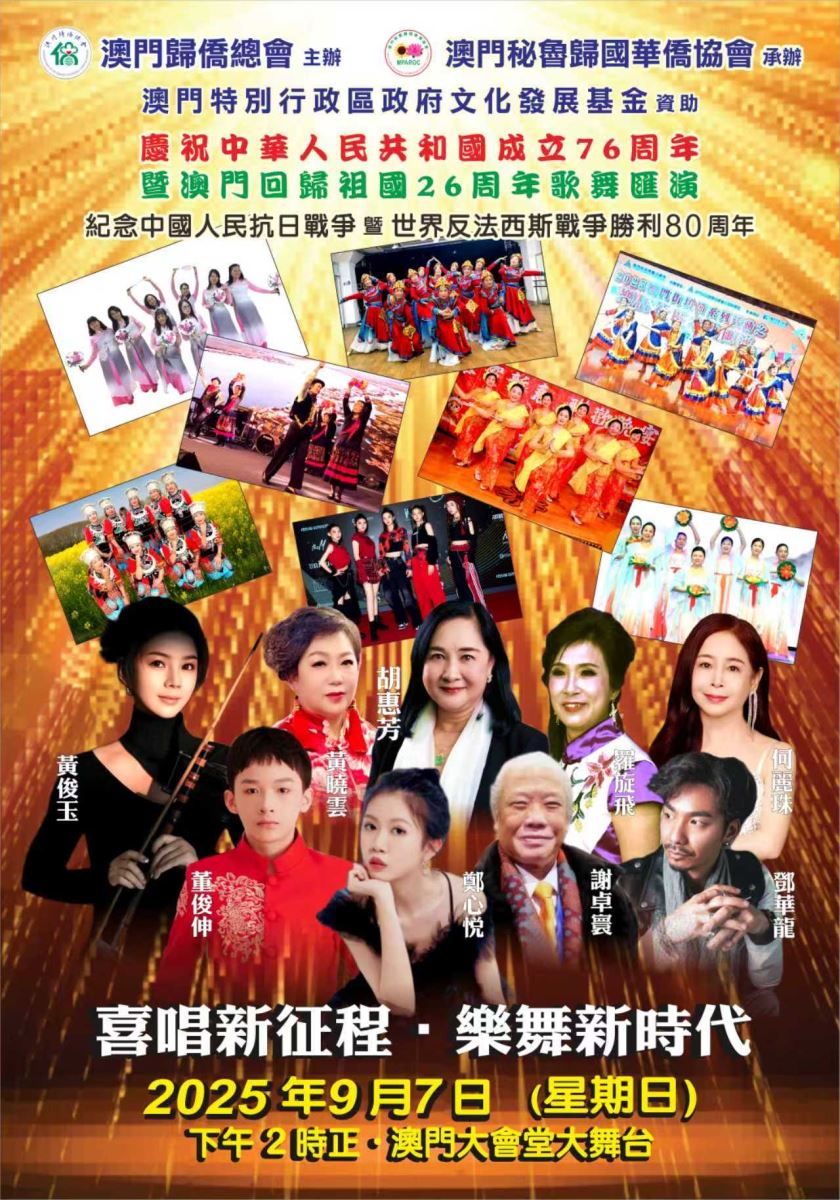 為慶祝中華人民共和國成立七十六周年、澳門回歸祖國二十六周年,同時配合特區政府構建以“中華文化為主流,多元文化共存”交流合作基地的施政,由澳門歸僑總會主辦,澳門秘魯歸國華僑協會承辦,澳門文化發展基金資助的“喜唱新征程‧樂舞新時代”澳門僑界慶澳門回歸26周年之愛國愛澳歌舞大匯演將於9月7日(星期日)下午2時,假澳門大會堂大舞台隆重舉行。傳承僑界“愛國愛澳愛僑愛鄉”之優良傳統,延續情系桑梓的美好品格。僑界愛國愛澳大匯演結合本澳與內地僑鄉的各表演者,共同歌頌與舞出對國家、對澳門的“僑心僑情”,增加澳門市民對僑鄉文化的認識,促進澳門多元交化交流,活動融入歌舞匯演等形式,開展具有僑特色的多元人文交流,凝聚僑心,相互促進,共譜愛國愛澳愛僑的美好樂章。