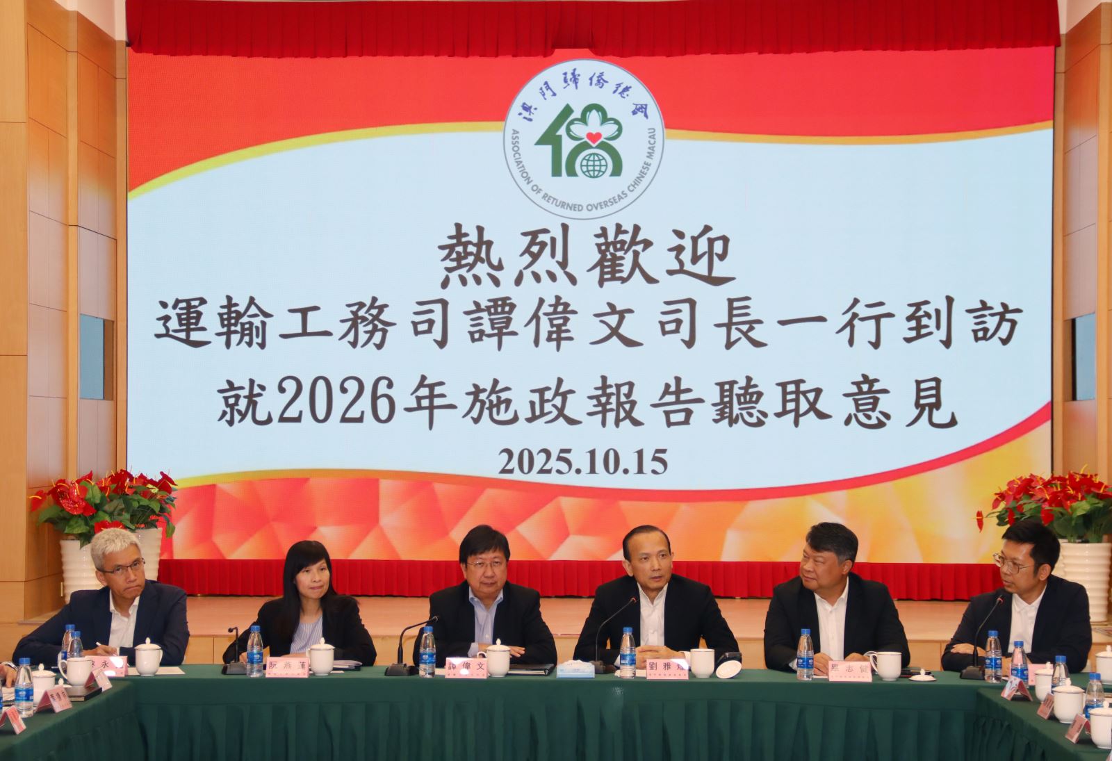 運輸工務司司長譚偉文一行於10月15日到訪澳門歸僑總會並舉行座談,聽取本會就運輸工務範疇2026年度施政工作提出的意見和建議,獲會長劉雅煌、理事長畢志健等的熱情接待。