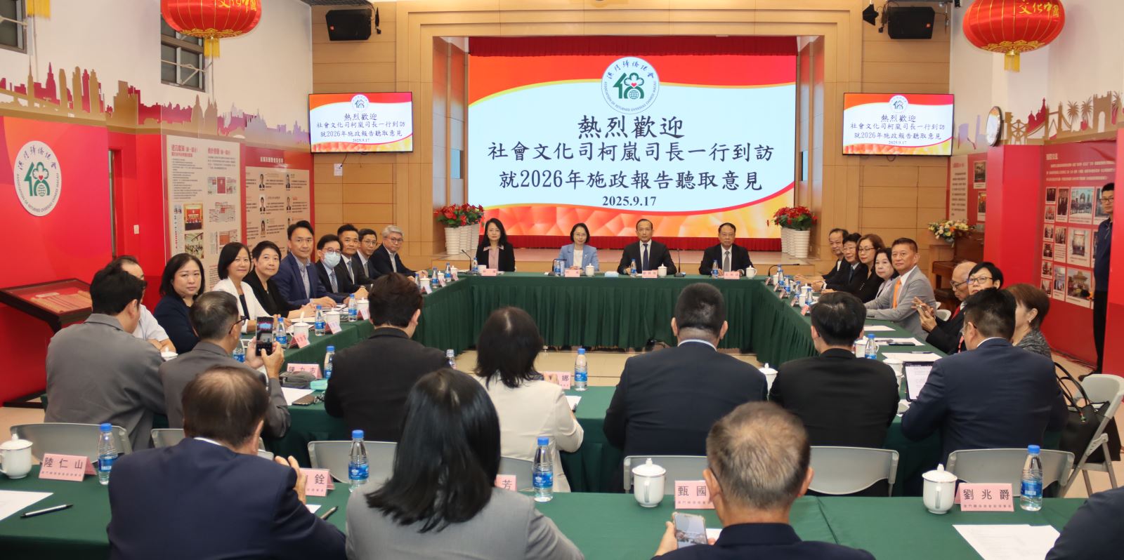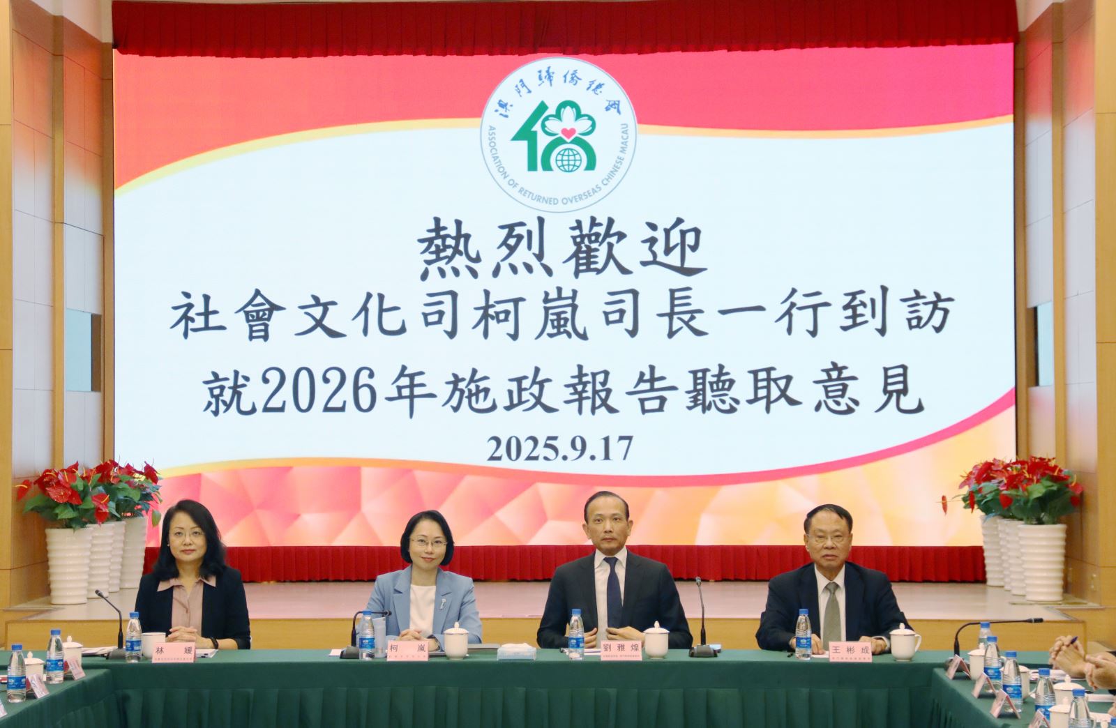 社會文化司司長柯嵐一行於9月17日到訪澳門歸僑總會並舉行座談,就編製社文範疇2026年度施政方針聽取意見和建議,獲會長劉雅煌、監事長王彬成等的熱情接待。