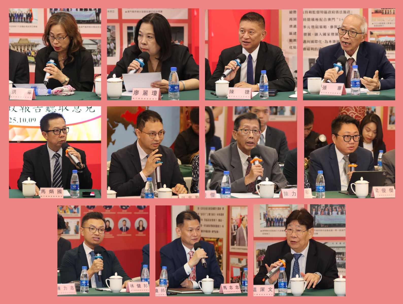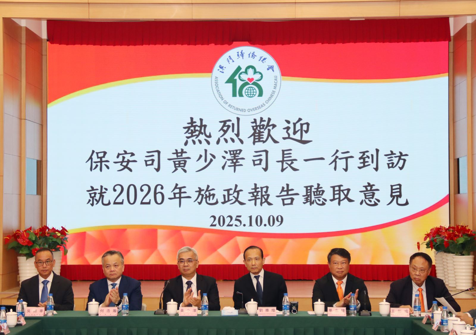 參與座談的還有保安司司長黃少澤、海關關長何浩瀚、治安警察局局長吳錦華、消防局局長王健、保安司司長辦公室顧問梁浩賢、司法警察局副局長蘇兆強、保安司司長辦公室高級技術員趙遠,以及檢察長辦公室代表等政府官員。僑界代表包括歸僑總會會長劉雅煌、理事長畢志健、監事長王彬成,副會長溫深文、洪華、陳捷、馬炳國、庾榮安、梁鋼,副理事長胡惠芳、謝卓寰、姚嘉聰、劉兆爵、陳江、林健邦、伍嘉敏、馬志忠等理監事成員。