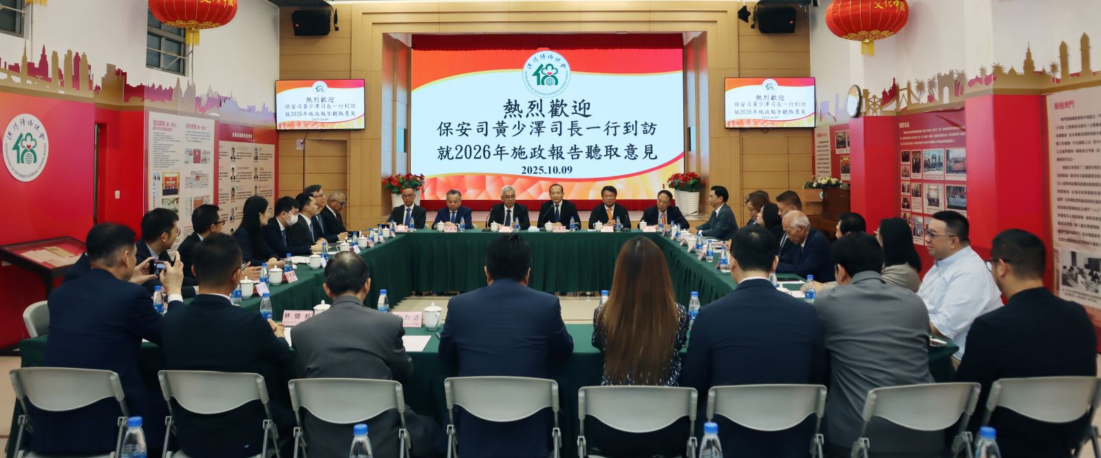 保安司司長黃少澤一行於10月9日到訪澳門歸僑總會並舉行座談,就編製保安範疇2025年度施政方針聽取意見和建議,獲會長劉雅煌、理事長畢志健、監事長王彬成等的熱情接待。