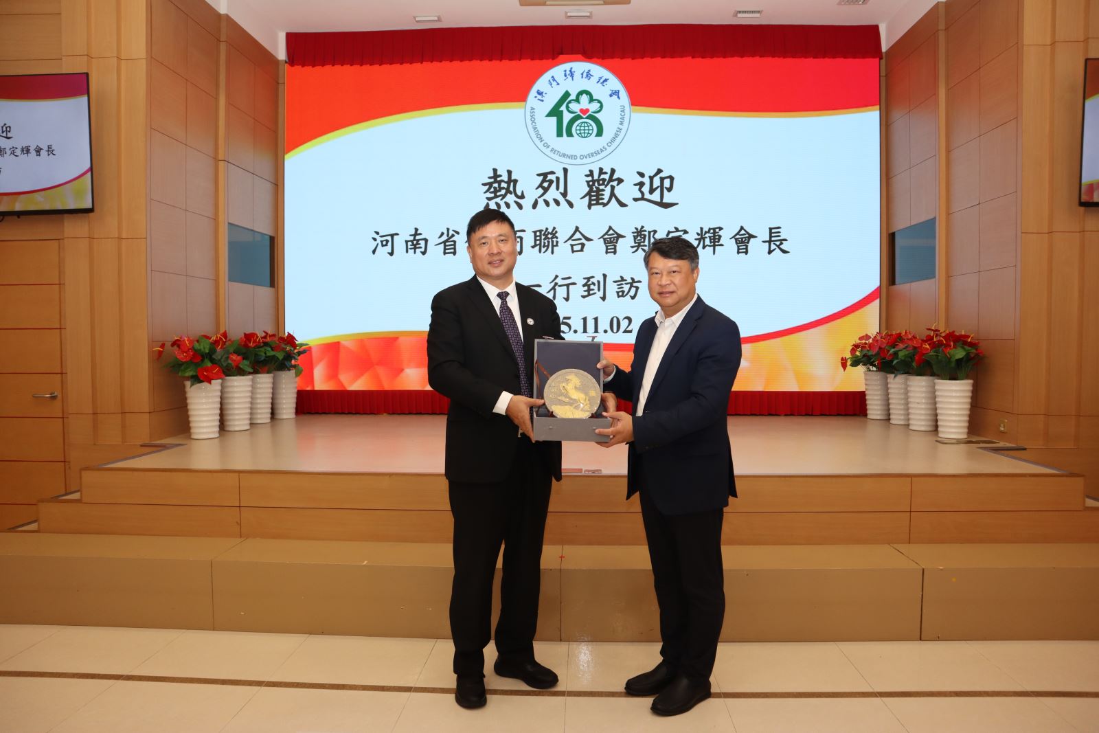 為深化豫澳兩地僑界交流合作,河南省僑商聯合會鄭定輝會長一行於11月2日拜訪澳門歸僑總會,獲本會理事長畢志健,副會長廖麗瓊、張華等領導熱情接待。是次座談會由本會副會長洪華主持。