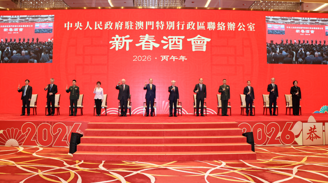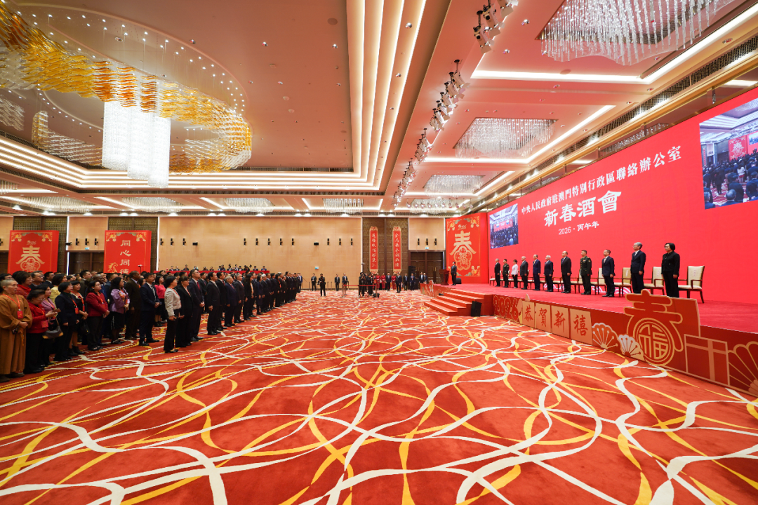 2月5日下午,中央政府驻澳门联络办公室举办2026年新春酒会。受中央港澳办主任、国务院港澳办主任夏宝龙委托,中央港澳办副主任、国务院港澳办副主任,中央政府驻澳门联络办公室主任郑新聪代表夏宝龙主任、中央港澳办、国务院港澳办和中央政府驻澳门联络办公室向广大澳门居民致以新春祝福。澳门特别行政区行政长官岑浩辉出席并致辞,全国政协副主席何厚铧,前行政长官贺一诚,外交部驻澳门特派员公署特派员卞立新,解放军驻澳门部队司令员于长江、政委林庆华,中央政府驻澳门联络办公室副主任黄柳权、吕玉印、张应杰,以及特别行政区立法、司法机构主要负责人,特别行政区政府主要官员,澳区全国人大代表、全国政协委员,特别行政区行政会委员、立法会议员,以及澳门社会各界代表人士约1300人出席酒会。